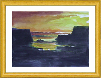 SUNSET AT PIRATE’S LANE: A beautiful Gloucester harbor sunset taken from the parking lot of the Cape Ann Art Association. This watercolor was, painted from a series of sunset photographs over water.