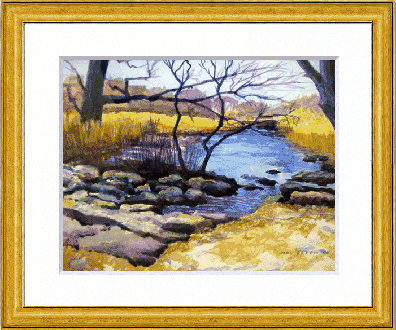 WINTER PATH: Watercolor, painted from a photograph taken on a winter walk near my home in Gloucester. A late winter thaw had melted a pond reflecting the pale sky and the colors were bright and wonderful for that time of year,which made for a wonderful subject to paint.