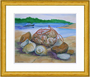 WINGAERSHELLS: A Watercolor. Ever since I moved to beautiful Gloucester, I would pick up a shell or a piece of interesting flotsam as a souvenir of my daily walks on nearby Wingaersheek beach. This was painted partially as a still-life and the background is a remembered scene at the beach. SOLD A second and similar painting was commissioned to balance this painting and hung on the other side of a fireplace.